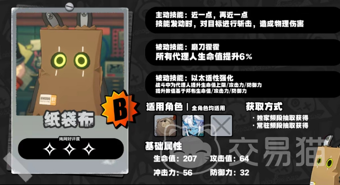 纸袋布还自带生命值加成的小福利。他的技能效果能让所有代理人的生命值提升6%,别小看这6%,在关键时刻它可能就是决定胜负的关键。而且这个加成效果还与纸袋布自身的属性息息相关,生命值加成,攻击力还有防御力越强,带来的加成也就越明显。这就像是给团队穿上了一层隐形的防护罩,让每个人都能在战场上更加精悍。