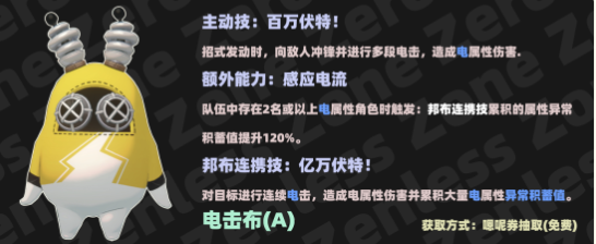再来说说他的“感应电流”这个被动技能,听起来就挺高科技的。就是当队伍里有两个或以上的电属性小伙伴时,邦布的连携技威力就更上一层楼了,异常值叠得飞起,整个队伍的输出效率都能得到显著提升,这简直就是电系小分队的福音。说到连携技“亿万伏特!”,那更是邦布的拿手好戏。这技能一出简直是电闪雷鸣,目标敌人瞬间被淹没在无尽的电光之中,伤害爆表不说,还能疯狂累积电属性异常值。在关键时刻这一招往往能扭转战局,让敌人措手不及。