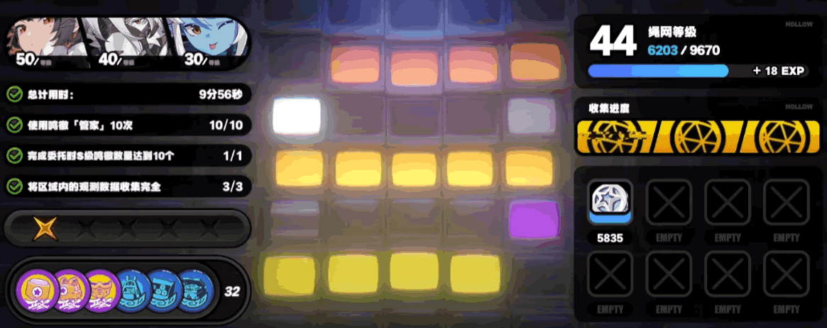 最终可以理解为,通过棋盘的行动触发各种事件和战斗,得到资源,这个资源包含了几乎所有元素。再通过鸣徽管家触发事件,消耗资源在事件中交易鸣徽上限和鸣徽,使两者数量都超过20。