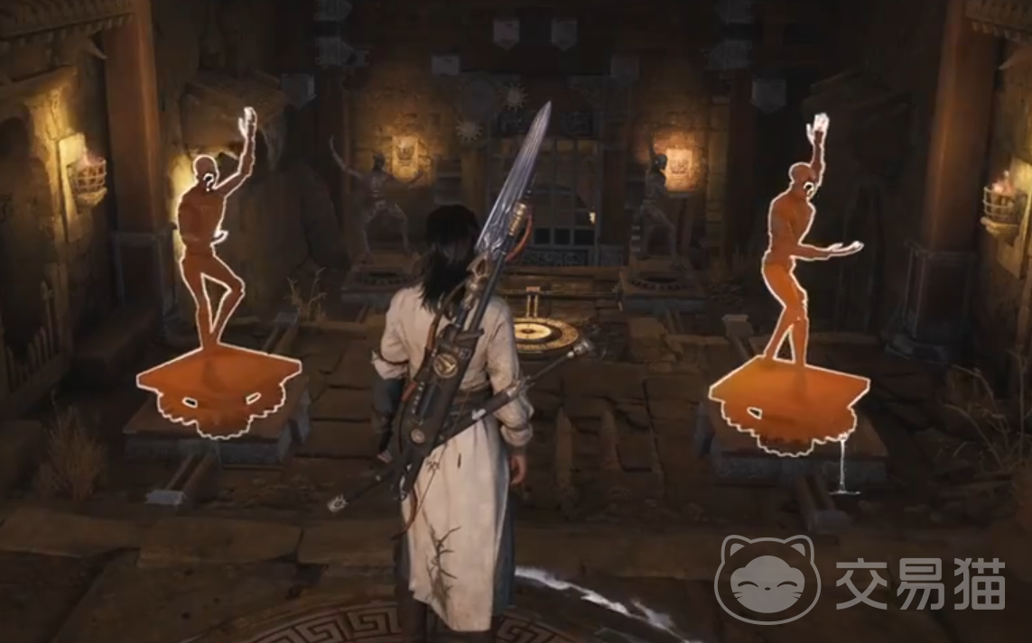 我们想要过去就需要让两个铜像转动的朝向一致,这里靠圆盘是无法做到的,我们需要利用点穴技巧,将一个转动的铜像定身,等另一个转动到一个方向后门就会打开,接下来就会进入第二个场景,同时也是铜像。