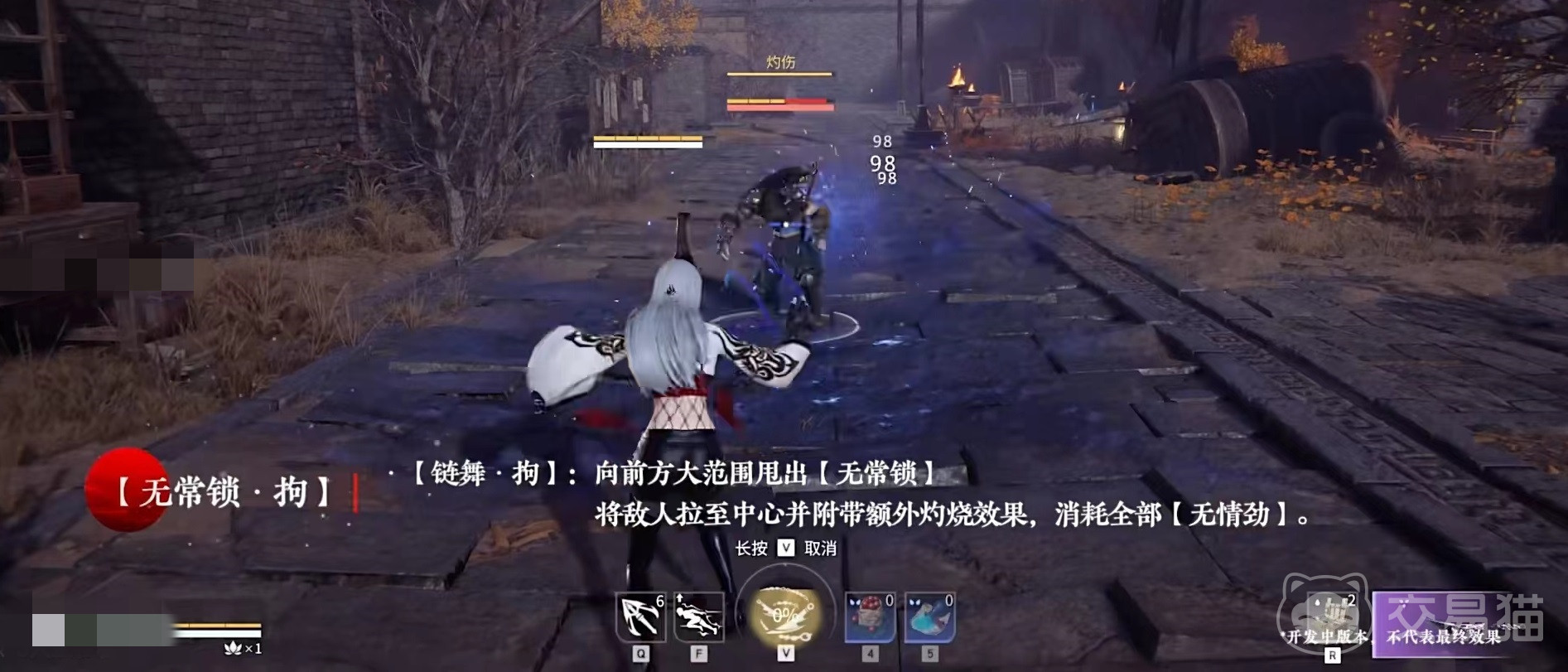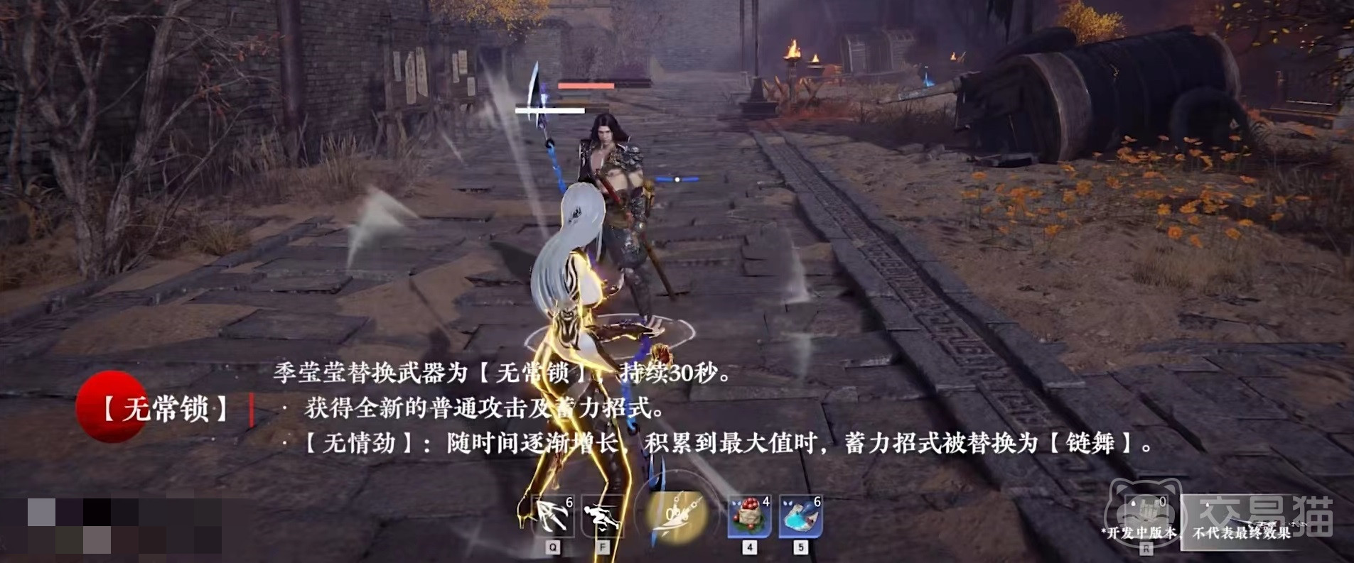 第一个奥义技能无常锁,将自己武器替换称为无常锁,持续三十秒钟。具有无情劲和链舞两个招式。无情劲随着时间逐渐增长累积到最大值时,蓄力招式就会被替换为链舞,该招式可以向前方快速甩出进行连续三段打击且恢复自身,需要将无情劲全部消耗掉。第二个奥义不同之处在于链舞变成了链舞拘,向前方大范围甩出无场锁,将敌人拉至中心,并附带额外灼烧。