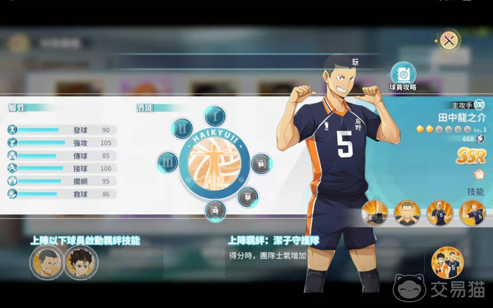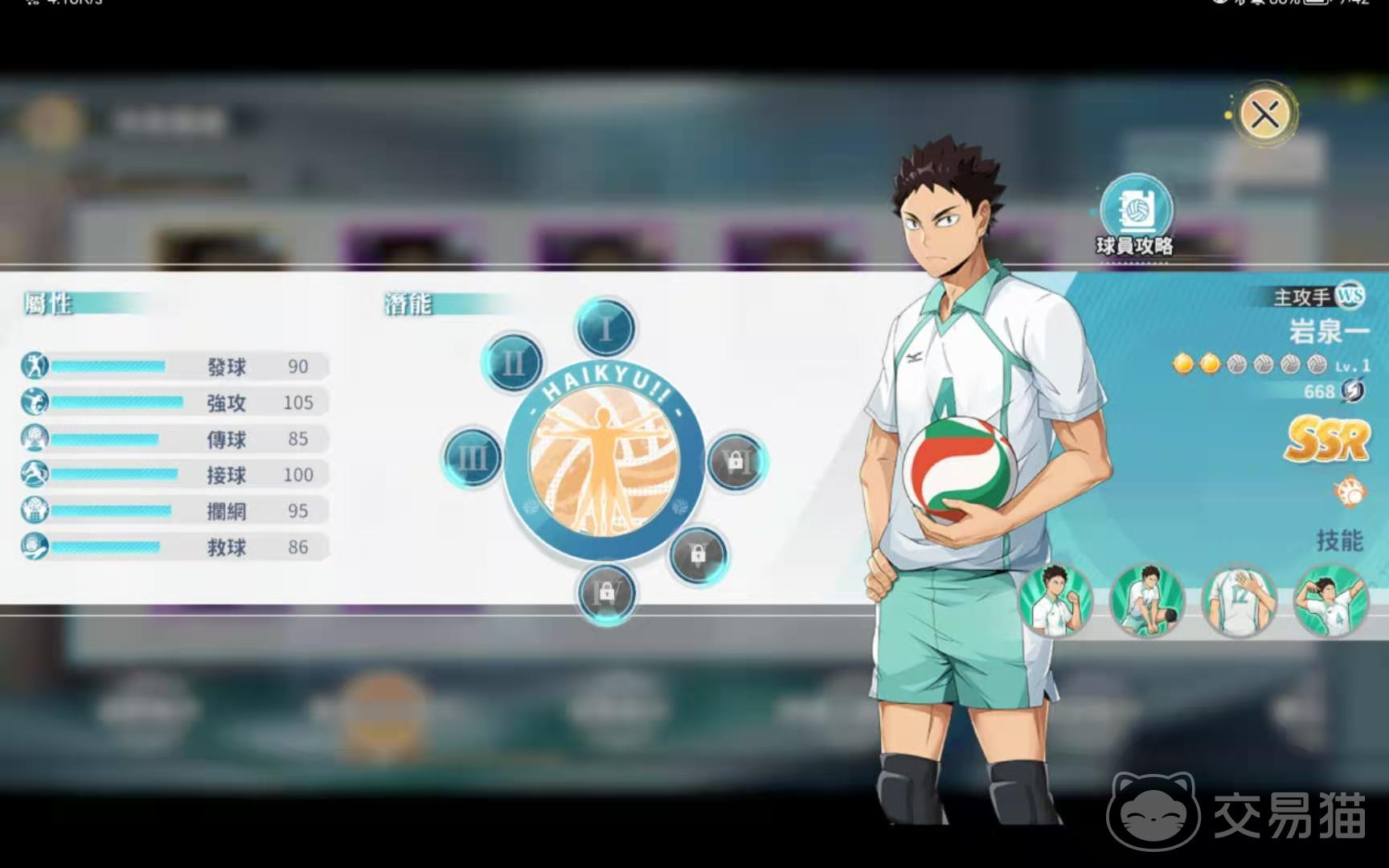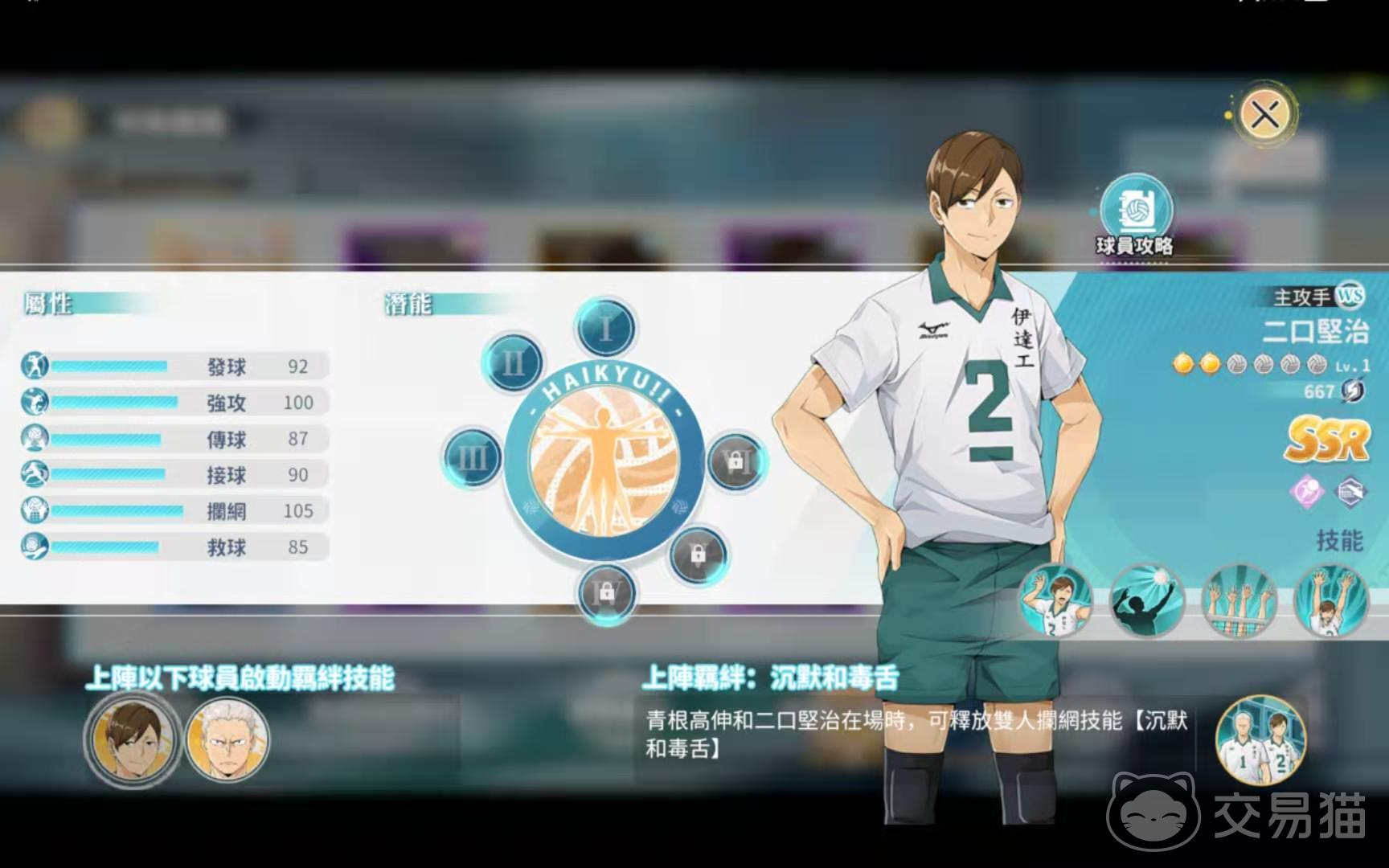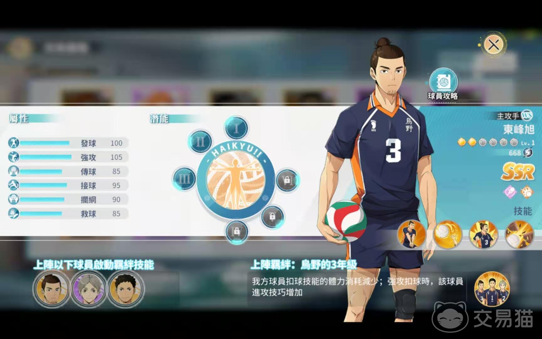 这是一个SSR级别的球员,虽然很难抽到但确实很好用,作为主攻手,他的各项属性都很高,甚至可以充当一下发球手,当触发上阵羁绊之后,进行强力扣球时,体力消耗会变低。