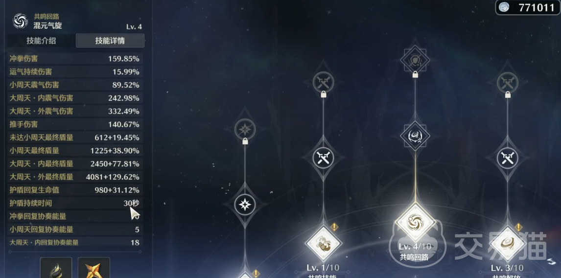 如图所示点开鉴心的共鸣回路,展开技能详情,可以看到有显示盾量是一串数字+百分数,通常来说如果没有单独说明,就是吃攻击力加成。