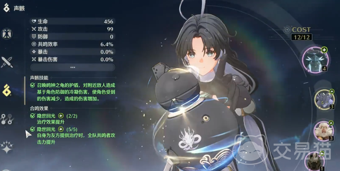 这样一来思路就清晰了,武器用攻击加成的“骸行”,其词条的效果也开始可以用来提升鉴心的坦度。主声骸携带鸣钟龟,进一步提升整体的生存能力,套装用治疗套。主声骸选治疗加成,副声骸选攻击、共鸣效率加成的,毕竟是走纯辅路线了,双暴就可以考虑丢掉了。
