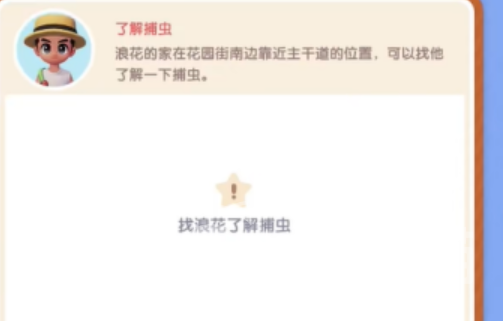 当玩家成功的跟npc对话之后,并且了解了捕虫的相关细节,此时在npc的指导下来到了指定的地点,之后跟浪花开始对话,对完话以后就可以获取对应的捕虫任务。