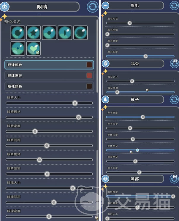 最后是五官的微调。其中最重要、细节最多的毫无疑问是眼睛,都说眼睛是心灵的窗户嘛!连瞳孔都可以设置成心形或者星形呢!更是包含了大小、形状、间距宽窄和眼球瞳孔的每一处细节。眉毛、耳朵、鼻子和嘴虽然没有如此多丰富元素,也足够表现出微小细节的不同。