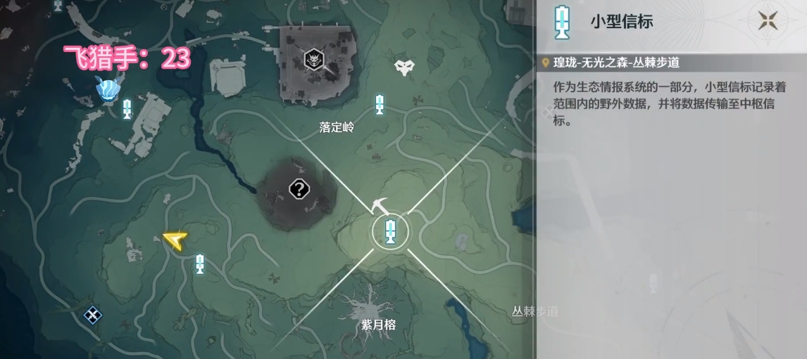 拾取到第二个飞猎手后,传送到紫月榕上方的信标点,到了后朝地图的左上方行走,翻越过一个小坡后能够看到在前方有一个木箱子,这就是第三个飞猎手的位置;