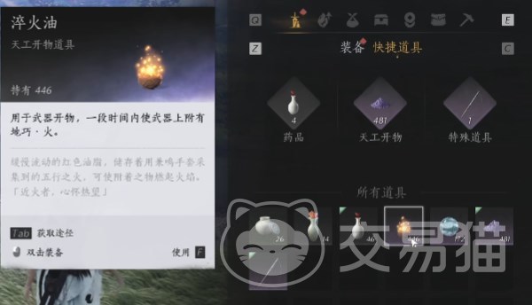 附魔其实在游戏里的专业术语叫做“天工开物”,可以给武器附加上一些额外的效果。目前可以附魔“淬火油”、“淬水蜡”、“淬毒散”这三种属性。