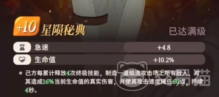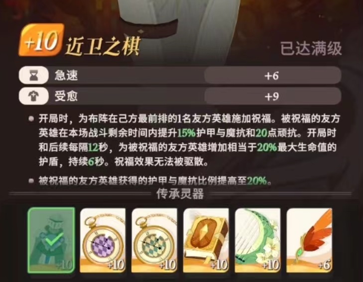 第3个是星陨秘典,每累计释放四次终极技能,就能造成一道焰流攻击场上的所有敌人,造成16%当前生命值的真实伤害,并降低其攻击速度。当解锁之后这一个就要立即升起来,因为带来的伤害加成是非常出色的,按照生命值打出真实伤害,在很多战斗中都有着很好的效果。第4个是近卫之棋,开局时为布阵在对前排的友方英雄添加祝福,被祝福的友方英雄在本场战斗剩余时间内提升护甲和魔抗。开局时和后续每隔12秒钟都能为祝福的友方英雄增加护盾,它可以显著增加前排坦克硬度。