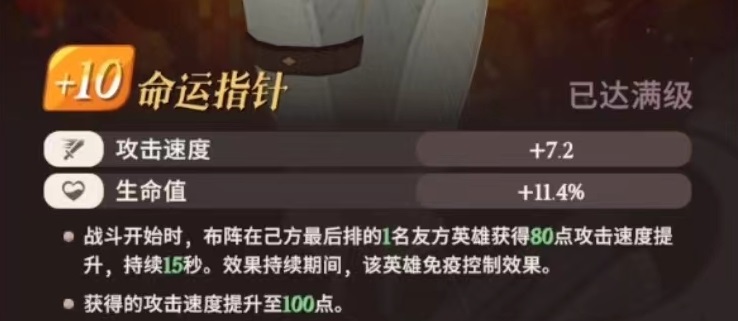第2个命运指针,在战斗开始的时候,布阵,在己方最后排的一名友方英雄获得攻击速度提升,持续15秒钟,在效果持续期间,该英雄免疫控制效果。获得的攻击速度最多能达到100点,延长时间能够达到20秒。这就是一项比较有针对性的措施,并不适用于所有队伍,但如果拥有那些需要强力开局先手的英雄来说是最为合适的。可以使得开局就放大招这种流派变得更为暴力,所以是否要选择要看自己的阵容情况。