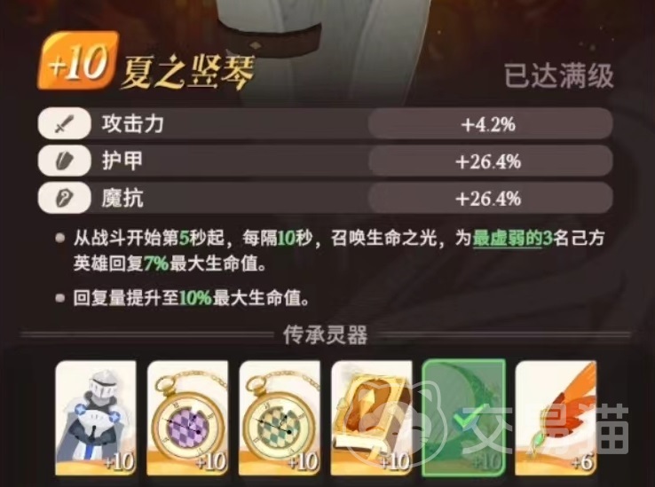 首先推荐的是夏之竖琴,它的效果是在战斗开始第5秒钟,每隔10秒就能召唤生命之光,为虚弱的三名己方英雄恢复7%最大生命值,回复量后来还可以提升至10%的最大生命值,前期推图时候肉盾是非常关键的,有了这样的道具来帮助恢复血量,自然可以提升整体续航能力。