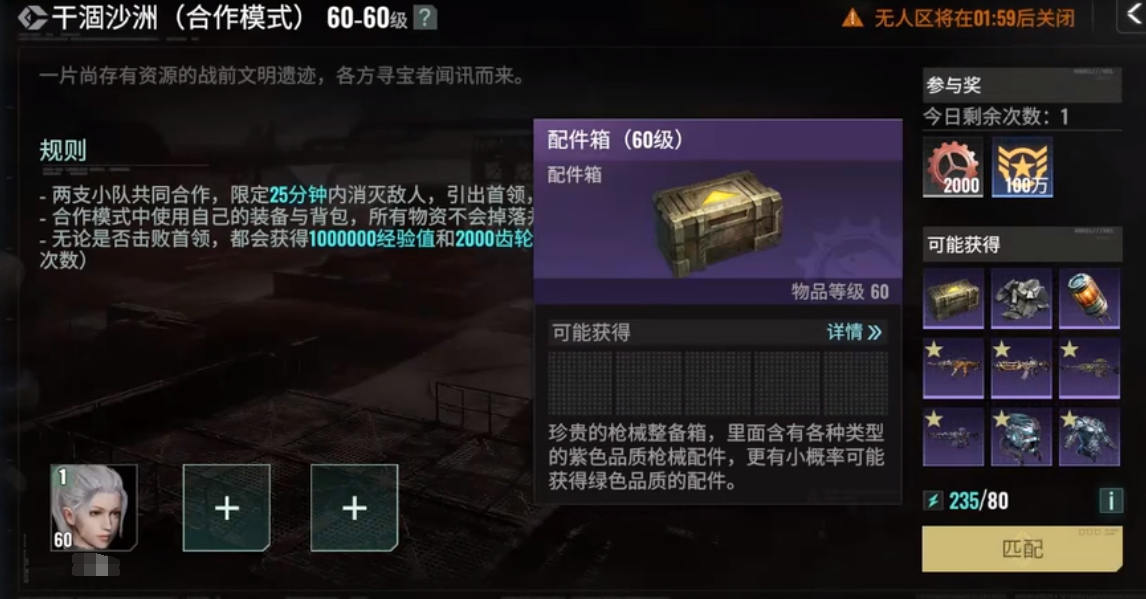 无人区位于干涸沙洲,每天在13:00~15:00、19:00~23:00两个时间段内的整点开放,每次开放25分钟,不限制每日参加的次数。但是玩家参与活动会消耗体力,系统每天会赠送体力减免的次数,参与合作模式的时候自动体力减免40点,周一到周五每天一场,周末两天每天两场,没有消耗的体力减免次数最多可以累积15场,而且好消息是累计次数与争夺模式共享。