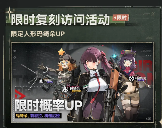 全新的精英武器传颂之诗、标准武器科夫罗夫、旧式武器旧式科夫罗夫也将在新版本与大家见面,此外还将开启限时的复刻访问活动,在这期间抽取限定人形玛琦朵的概率将大大提升。