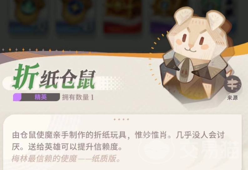 折纸仓鼠在游戏中其实就相当于一种英雄攻略道具,他是梅林最信赖的使魔,将其送给对应的英雄,可以提升一定的信赖度,能够有效的增加英雄之间的配合默契,属于比较稀有的游戏道具。