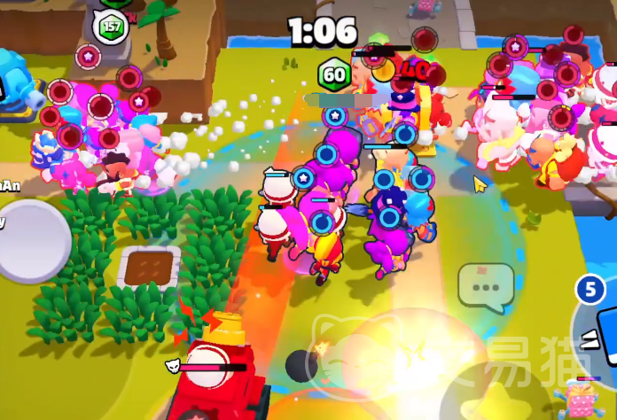 选择完角色之后就可以在游戏里组成一支队伍共同去收获宝箱,在游戏战场上玩家可以看到蓝色宝箱,只要打碎这个宝箱就可以得到金币或者宝石,同时也可以让玩家获得加速鞋,因为蓝色宝箱是比较稀有的,所以在开始游戏之后需要迅速进入到场景里寻找并且占领,然后玩家就可以在游戏里寻找大树或者是萝卜,玩家可以在这里收获到大量的金币和宝石。