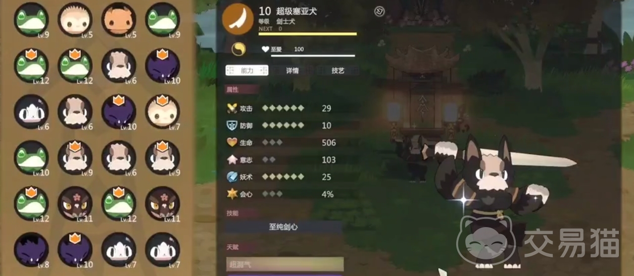 剑士犬是手持着长剑的黑柴犬,它的属性数据面板是:攻击29、防御10、生命506、意志103、妖术25,会心4%。可以从面板上看到,剑士犬是偏向于攻击与妖术的战士,可以作为输出的主力角色培养。