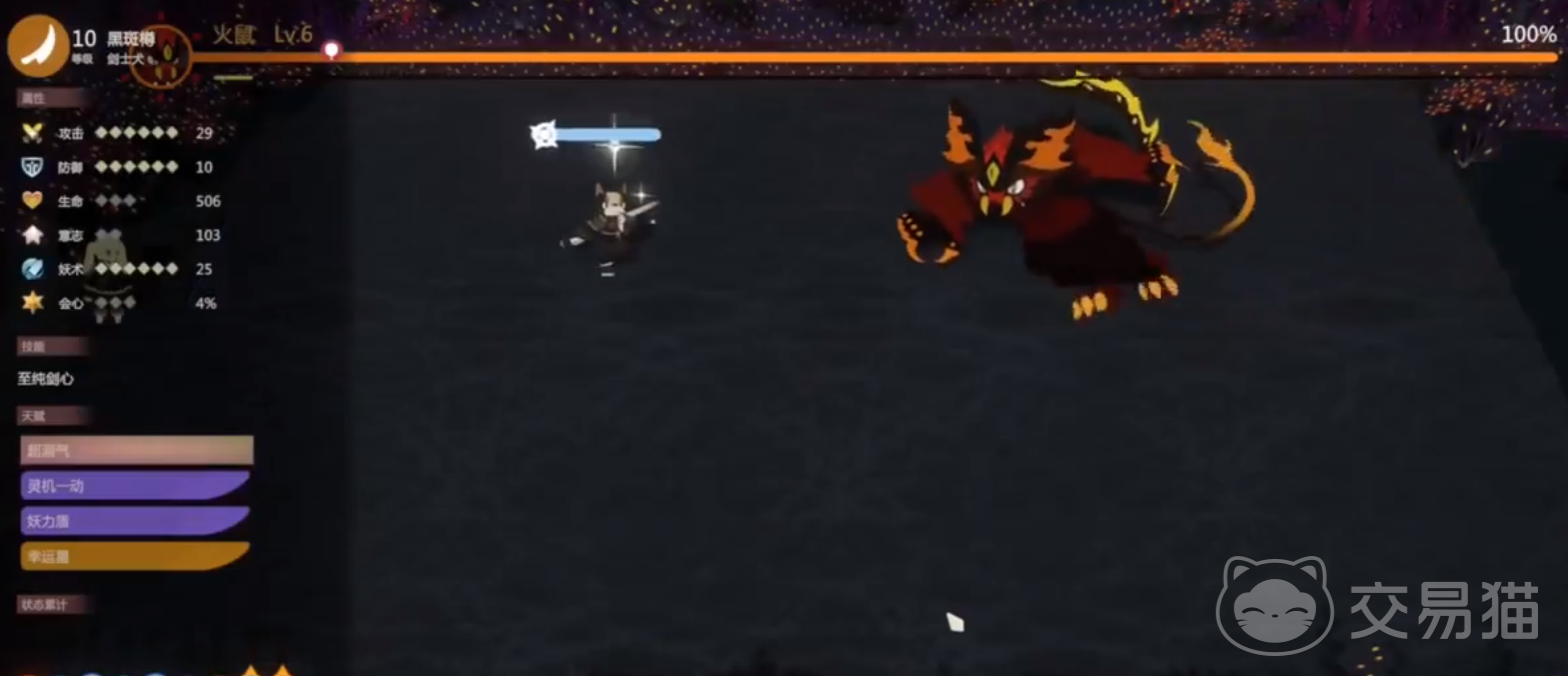 剑士犬可以携带4个天赋,分别是超淘气:每秒减3%的最大生命值,而妖灵恢复加10。灵机一动:发动妖术的时候有35%的几率,不消耗妖力。妖力盾:发动妖术后获得150点护盾。幸运星:其他天赋中含有概率,触发的几率翻倍。最后一个幸运星天赋是比较后期解锁的橙色天赋,解锁之后,灵机一动成功的几率有70%,剑士犬可以在回合节省妖力释放更多技能。