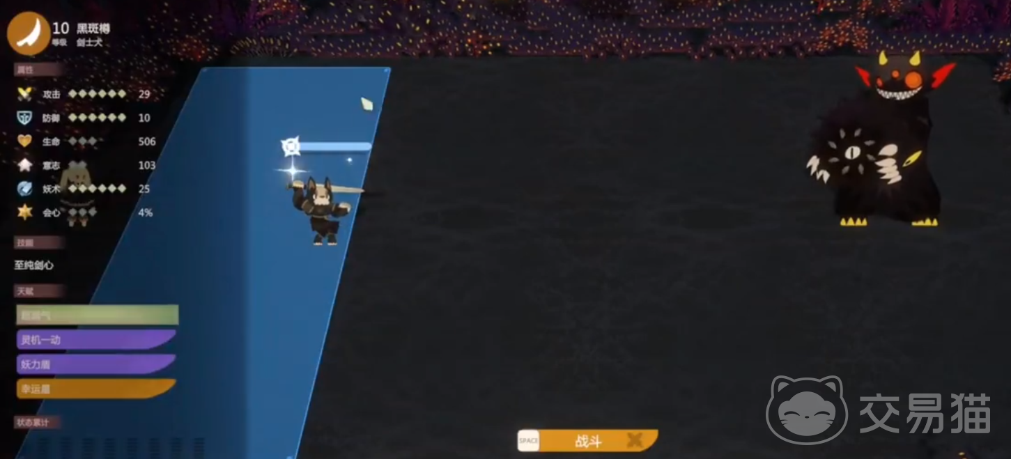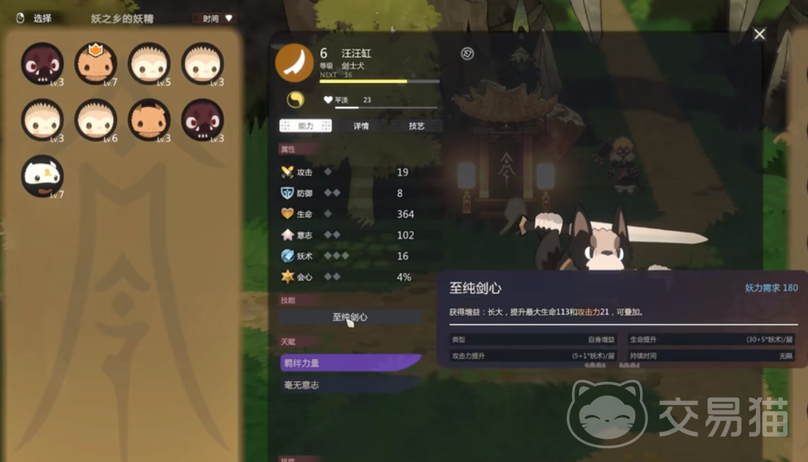 剑士犬特有技能至纯剑心:这是个增益类型的技能,需要消耗180妖力。效果是长大并且获取最大生命113,攻击力21点,而且这个技能在回合的战斗中还能叠加。