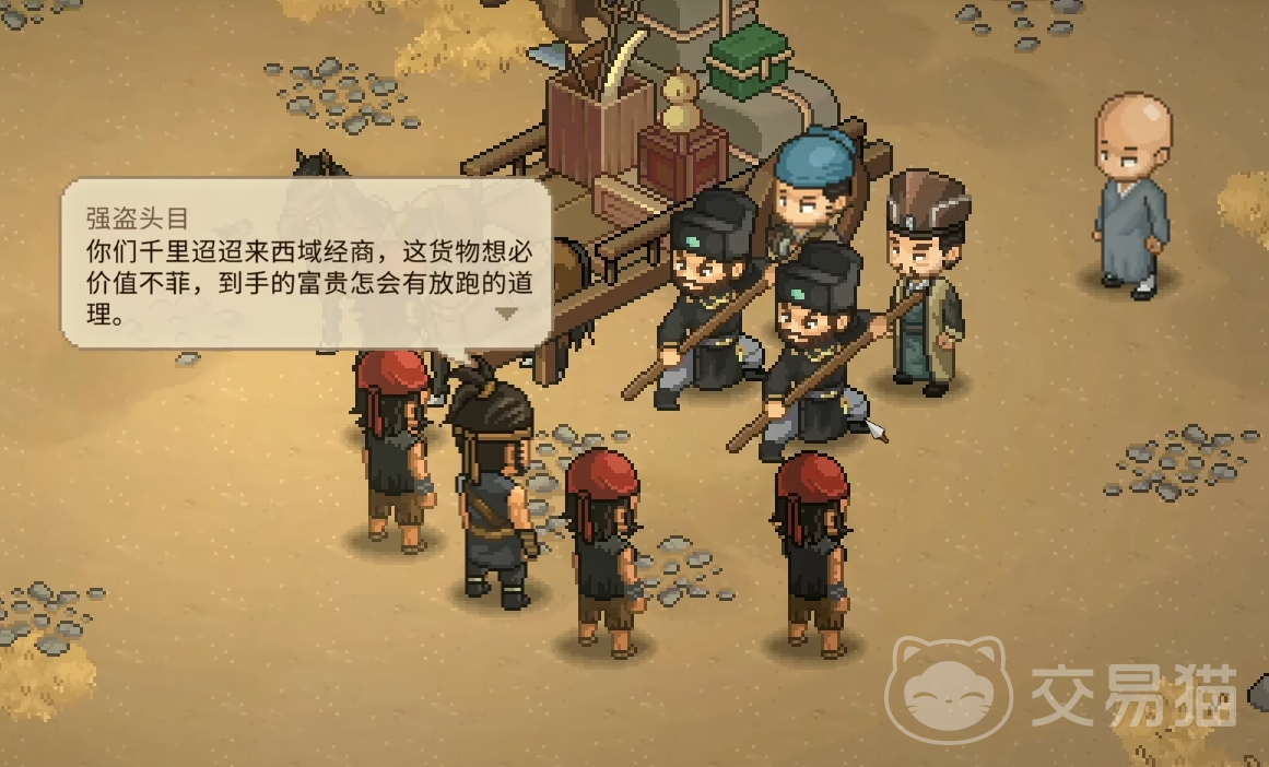 其中B,C两个尽量不要选择,b会让江湖人走掉一半,c则是会触发玉门关被灭的事件。之后玩家们便可以出关了。出关之后的地区都可以称之为西域地区。接下来的文章将会为玩家们介绍一下一些西域的事件。首先一出去就会看到有强盗在抢茶商的货。这里面会有三个分支,如果选择不管,则是护卫茶商的任务直接关闭。