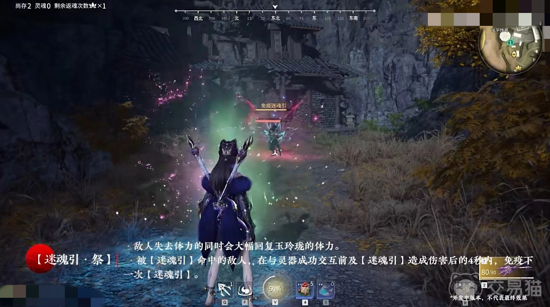 她的第1个技能尾袭,击飞身边敌人并获得狐火状态,持续三秒钟,被攻击导致硬直时会直接引爆,再次击退周围敌人。第2个技能,瞄准方向后释放狐尾并生成法阵,持续六秒钟,敌人会被强制拉至法阵中心并受到伤害。第3个技能瞄准方向后释放狐尾生成法阵,队友进入法阵,会将周围敌人击飞,并获得狐火,持续5秒钟。奥义技能迷魂引,吸取敌人魂魄并储存起来,对方需要在6秒内在灵器附近进行交互取回魂魄,否则就会进入迷魂状态,持续三秒钟。迷魂之后敌人会缓慢向灵器方向移动,期间无法进行操作和做其他动作,承受一定伤害后就会解除。