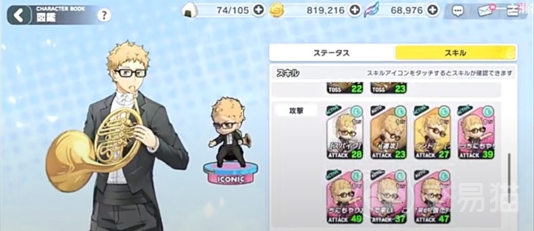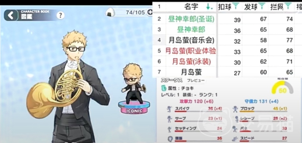 月岛萤这个角色也属于乌野高校阵营,从他的属性面板显示的数值来看,扣球的能力要比原皮月岛增加了5点,发球数值要比原皮月岛少了2点,接球也少了1点,拦网的面板数值确实非常优秀的,增加了12点的属性,总数值已经高达了77点从这一点可以发现月岛萤的防守属性还是比较优秀的了。
