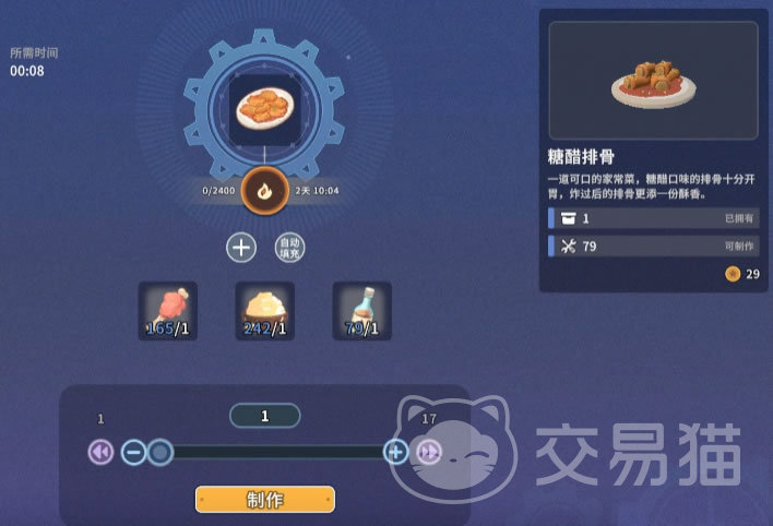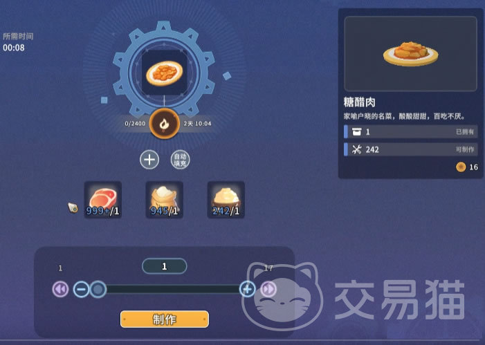 糖醋肉虽然名字里有醋,但其实在游戏中并不需要醋,是使用面粉、糖和肉烹制而成,也可以恢复体力。