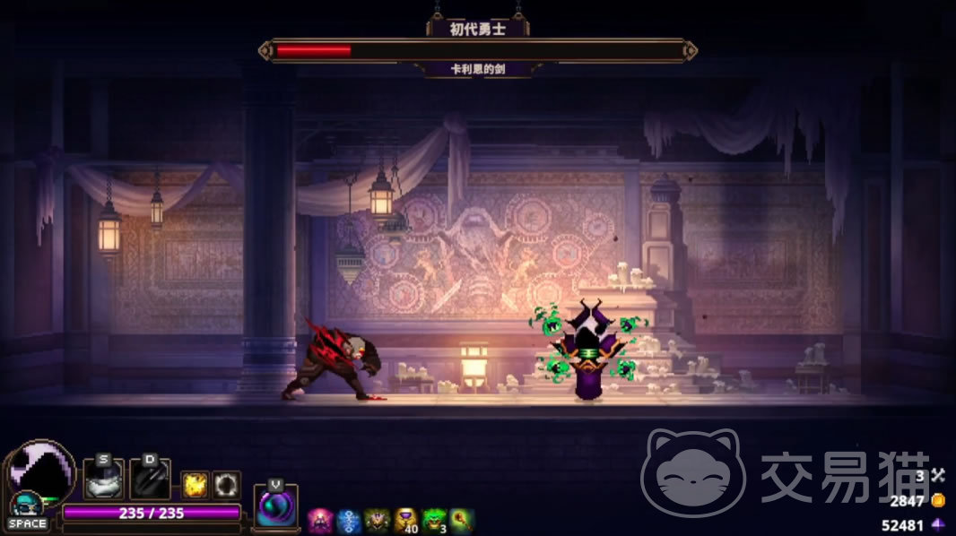 在对战勇士时要经历三个状态。第一个状态下勇士穿着披风,手拿宝剑,攻击以冲刺滑行后接一个突刺为主,偶尔会冲上半空,打一个冲天炮接着是向前半屏随机的落雷。不过只要保持边移动边攻击的战术,躲避也不是特别困难。