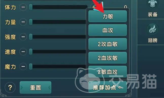 如果有了明确的发展方向,可以通过推荐加点进行快速操作。在弓箭手的推荐菜单中有五项选择可以快速加点;首先是力敏,就是2点力量2点速度的配;而血攻,则是2体力2力量;2攻血敏就是2力量1体力1速度。攻在这里就是力量,血则代表体力,敏代表速度,作为物理角色不需要魔力。但是这里没有设定强度,所以当需要防御力的时候还是要手动加点。