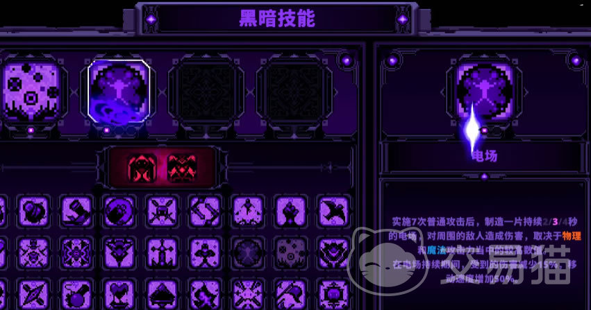 黑暗技能的选择可以先考虑电场,以及收集癖和志在必得这些。电场对于普攻型打法效果非常好,每7次就能制造一片结界伤害。攻速是囚犯非常重要的属性,在祭坛中尽早点满会大幅提升实战效果。