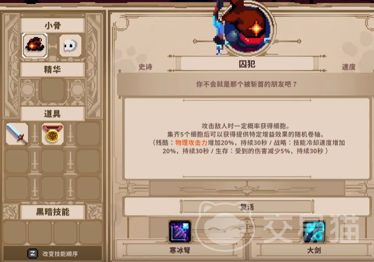 从面板介绍上我们得知,囚犯在攻击敌人时有一定概率获得叫做“细胞”的东西,算是一种能量吧。但积攒5个“细胞”时就算是充能完毕,可以获得特定的增益卷轴。卷轴类型有三种,第一是持续30秒的物攻buff增加20%;第二是30秒内技能冷却速度提升20%;第三是持续30秒的减伤效果5%。