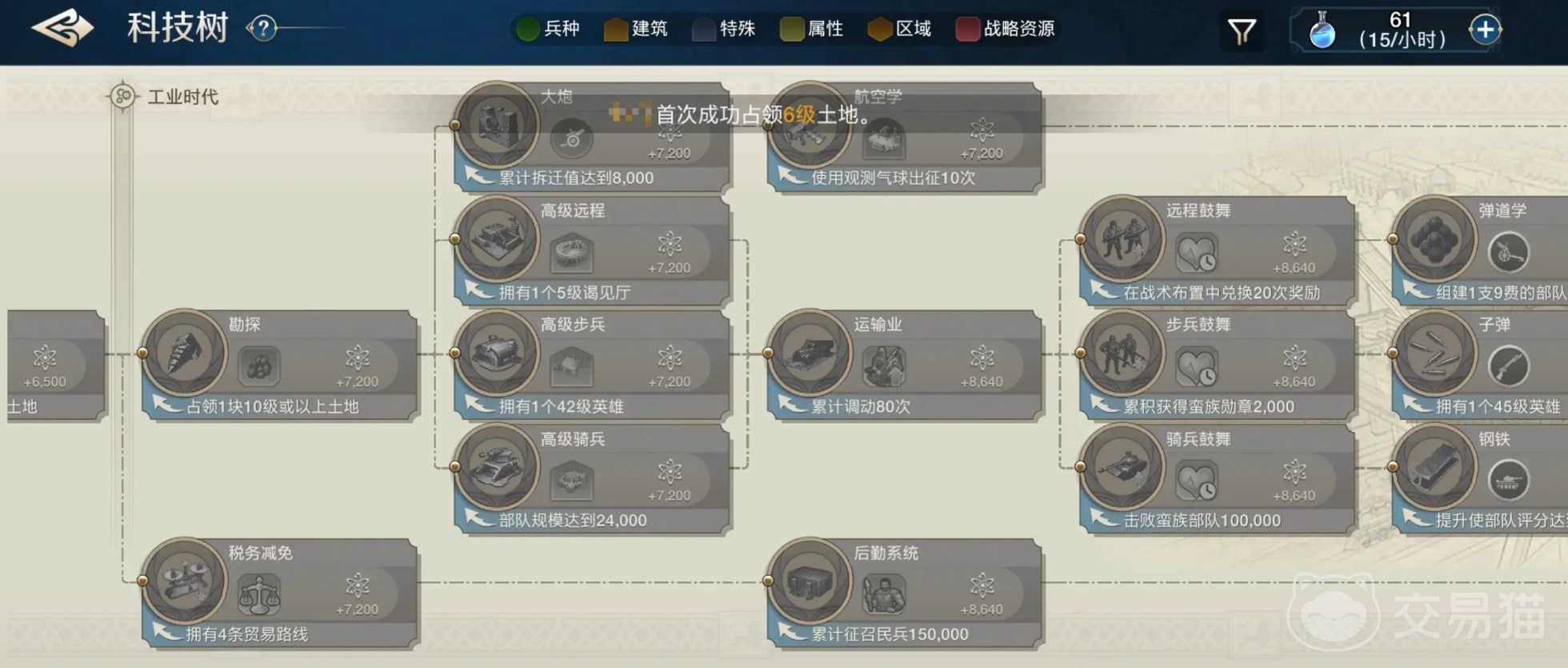 玩家可以在科技树中看到每个时代的特点,以及该时代中可以点出的一些技能树,距离工业时代,也就是蒸汽时代,包含了勘探,大炮,航空学,运输业,后勤系统,弹道学,等新条目,完成对应的要求就可以解锁。