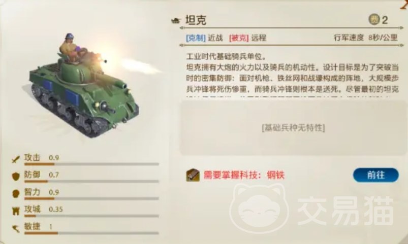 随时时代滚轮的不断向前,玩家也是可以解锁越来越多的高级兵种。远古时代的兵种比较少,近战只有“勇士",远程只有”投石兵“和”投枪手“,骑兵有”战车“,”侦察兵“,”大型战车“。除了侦察兵基本上都用不久,只是方便玩家了解游戏。
