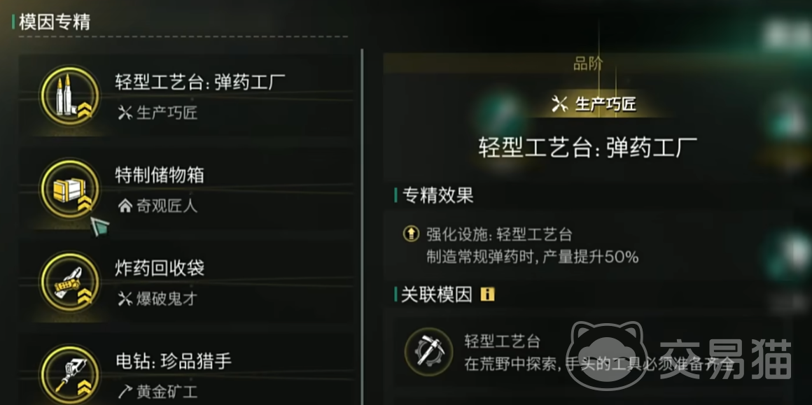 轻型工艺台:护甲克星,制作ap弹产量提升30%制造所需时间减少50%;pvp中T0级的模因,pve的话则没有那么多资源做ap弹。
