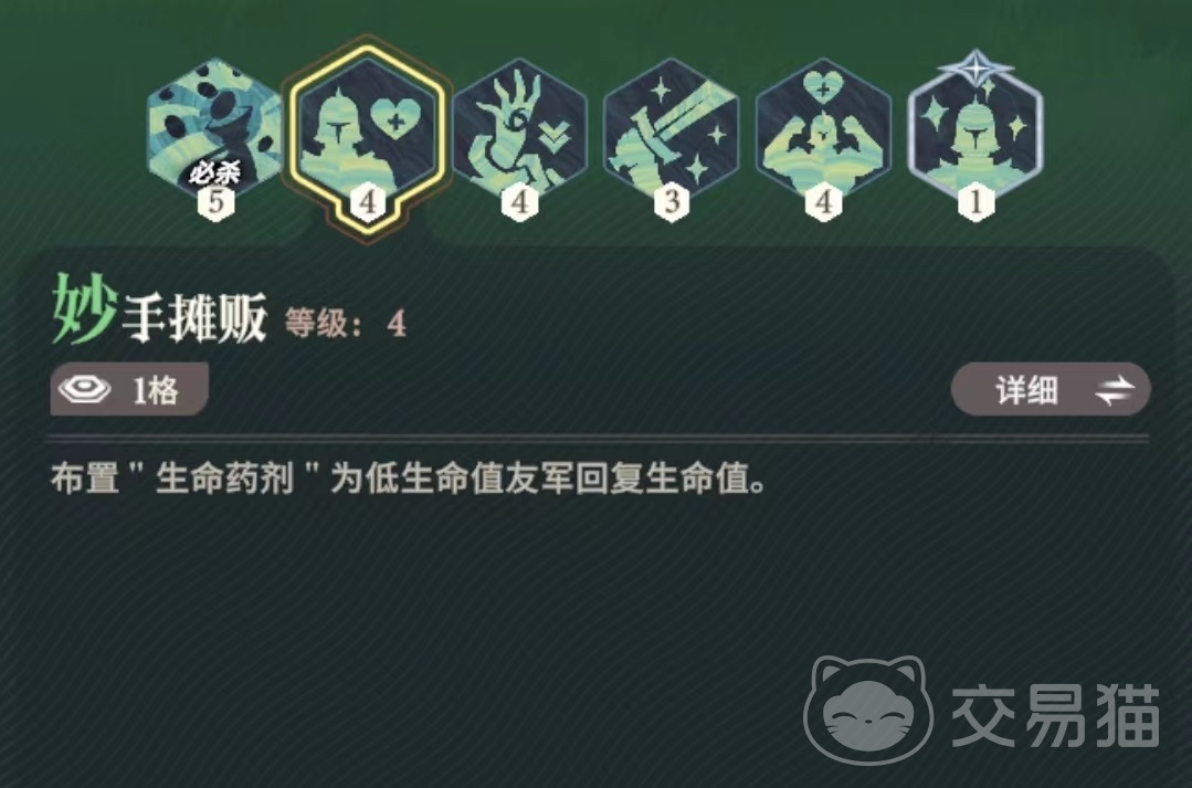 第1个技能人为财死,移动最多一格,到达目的地后抛洒金币,使两格范围内的友军恢复能量,最多能恢复320点。第2个妙手摊贩,在战斗开始时往自己的推车上放置两瓶生命药剂,以自身为中心,周围两格内的友军在血量低于半血时会自动使用一瓶药剂恢复生命值。每个友军6秒钟最多使用一瓶,4级生命药剂回复量最多能提升到45%的最大生命值,恢复效果还是非常可观的。