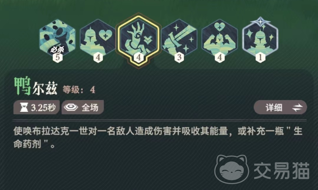 第3个技能的效果是召唤出布拉达克攻击敌人,造成伤害后可额外吸收目标能量,如果此时生命药剂消耗完毕,那么不再攻击敌人,而是召唤布拉达克补充一瓶生命药剂,每三次该技能中至少有一次触发本效果。接下来继续提升该技能等级可以增加伤害。该英雄的专精是在战斗时提高自身急速,并且三技能首次补充生命药剂之前再额外提升急速。