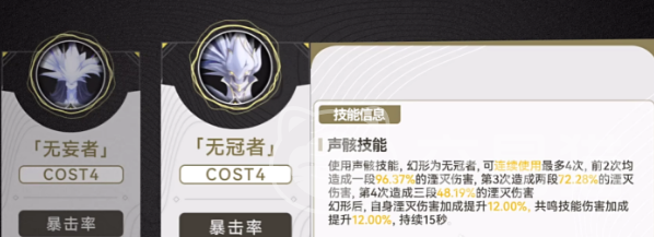 当然,当我们终于熬过了游戏的过渡期,有了更多的选择和资源,我们就可以追求更极致的搭配了。这个时候建议玩家可以考虑选择那些带有暴击或爆伤词条的金色声骸,比如紫鸟和乐师。特别是“无冠者”这个声骸,对于暴击率和暴击伤害的增加是非常高昂的。简直是后期玩家们的神器。