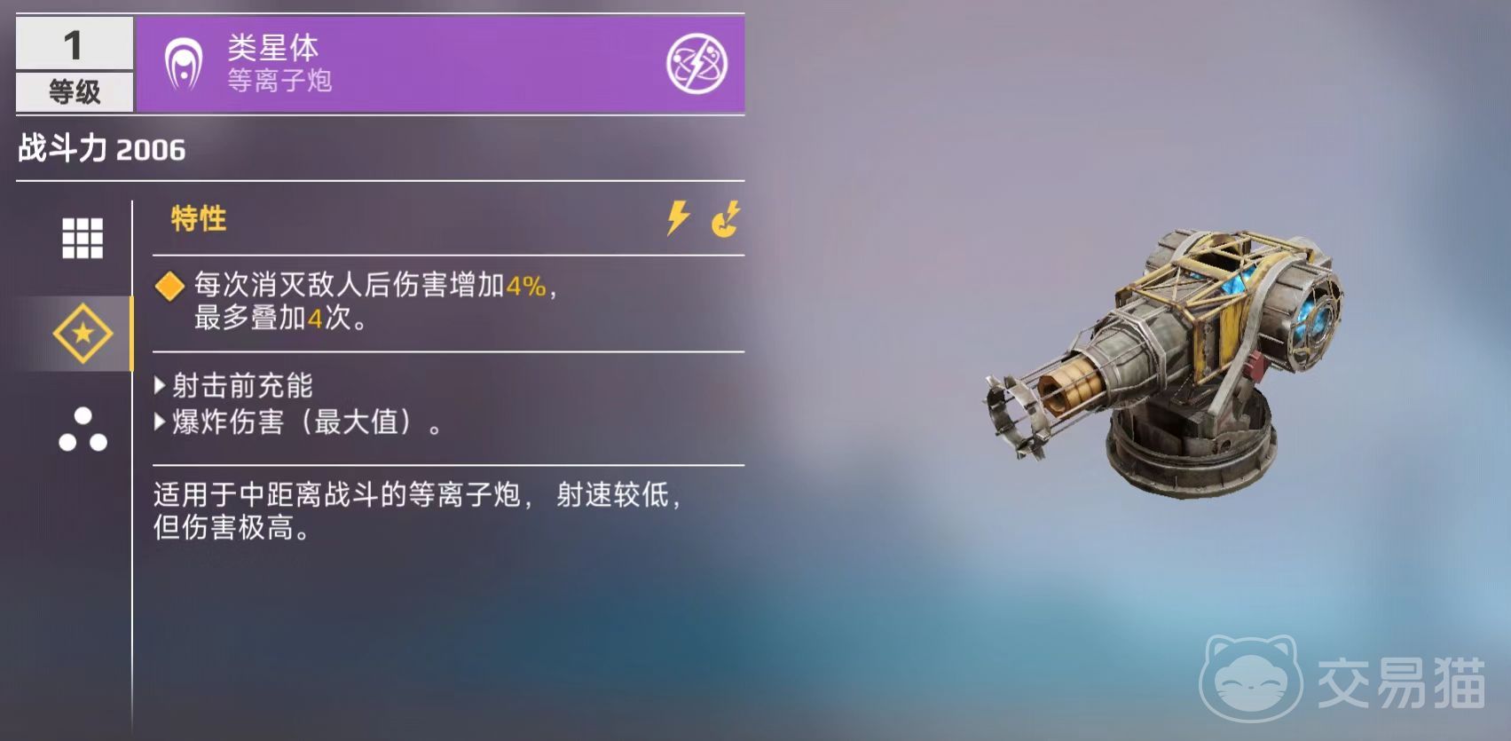 类星体的特性是在每次消灭敌人后都能增加4%的伤害,该效果最多能叠加4次,也就是总计有16%的伤害加成。作为等离子发射器,射击前需要进行充能,是一种用于中距离战斗的等离子炮。射速较低,但伤害极高,所发射出来的等离子体将会沿着直线飞行,击中目标后能发生爆炸。因为弹道速度缓慢,再加上自身在模型方面非常显眼,所以想要在远距离处击中目标有一定的难度。