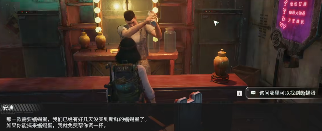 转身未离红衣小屋,新的任务“秘法心酿”又出现了。安迪,这位站在黑牡丹身旁的神秘人,正在为大家交代新的任务。简单对话后,大家需要寻找稀有材料。并在路滑的小摊上找到一枚蜥蜴蛋,得到此物之后回到安迪哪里,并且继续对话,即可完成任务。