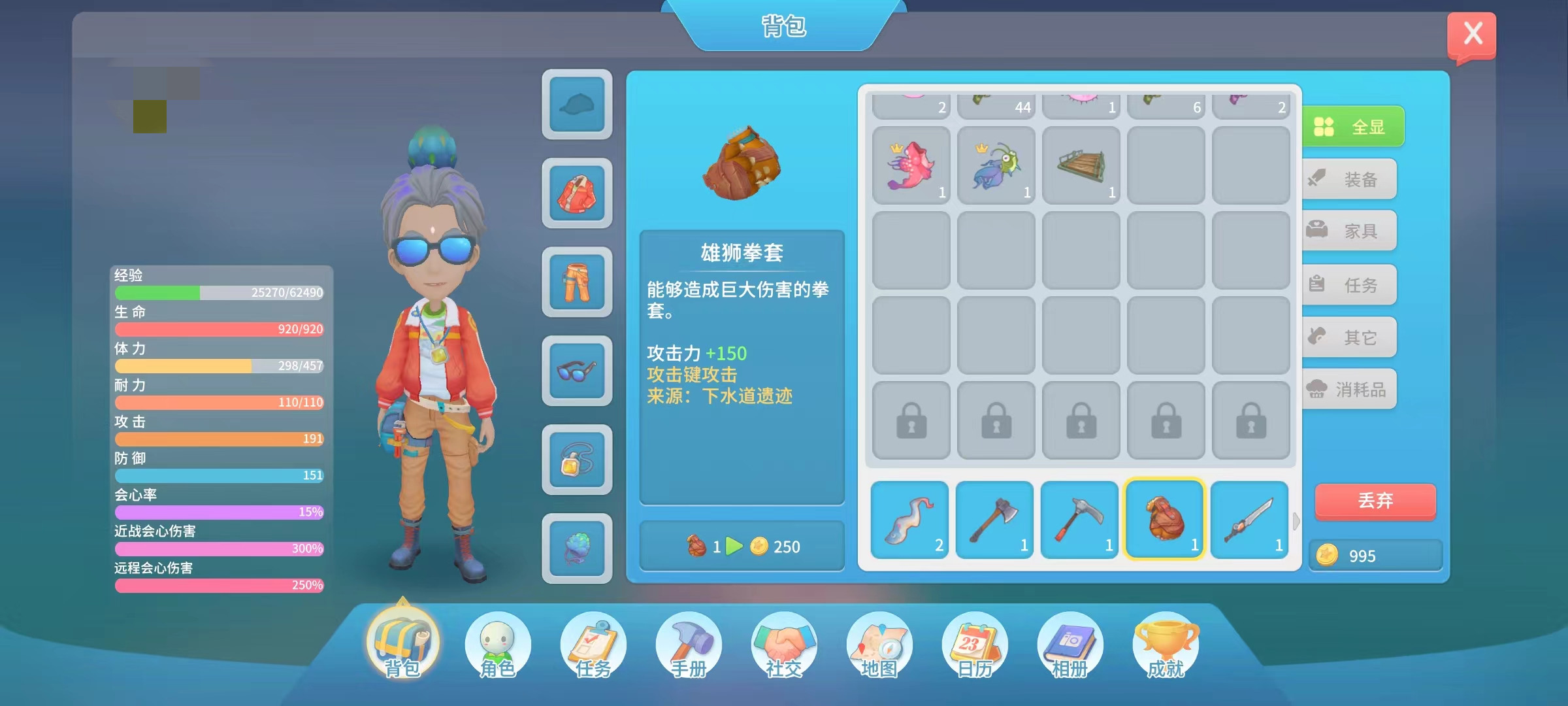 武器选择属性上自然是以伤害为主。攻击力越高越好。大家千万不要小看近战,例如雄狮拳套就能够增加150点攻击力,伤害威力巨大。在防具方面选择手指甲,头盔,手套,鞋子和护甲片,护甲片能够自己制作出来,然后随时进行补充。选择这些装备的理由就在于这一套可以实现高防御和轻重量。游戏中引入了重量的概念,大家身上携带重量将会影响移动的速度,如果过重,无论是移动还是战斗中走位都很不方便。