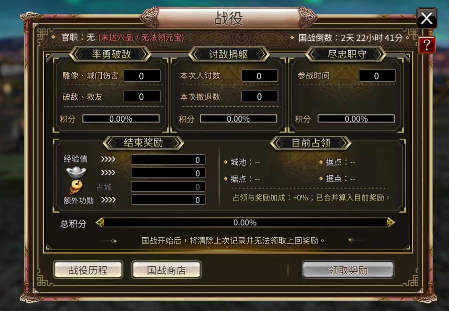 其中率勇破敌是国战期间对城门、雕像造成的伤害,讨敌捐躯是在国战期间攻击敌国势力的敌人,通过击败人数来获得奖励。尽忠职守是参战期间累计积分,如果没有出现在对方的地图中得不累积积分,另外还有占领加成,占据对方的城池获得额外奖励等。大家在主页面中可以直接看到国战的相关选项,包括各个环节造成的伤害以及击退人数和参战时间等。相应积分和结束时奖励都会在这里清楚展现出来,还可以看一下历程以及相应国战商店等。