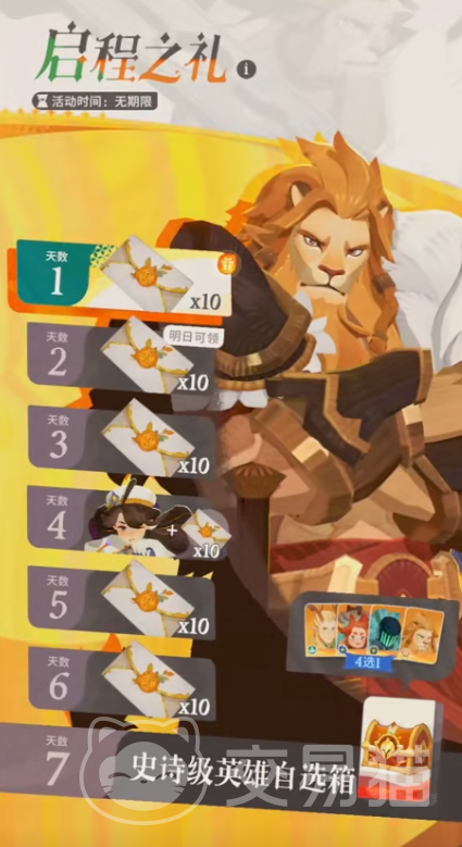 另外在第四天登录的时候除了抽卡道具之外,还可以免费获得一个英雄。让你上线之后就可以获得更多角色,无需费力的氪金。到了最后一天还可以获得一个史诗级英雄自选宝箱,开启之后即可从众多角色里面选取一个,满足你的需求。