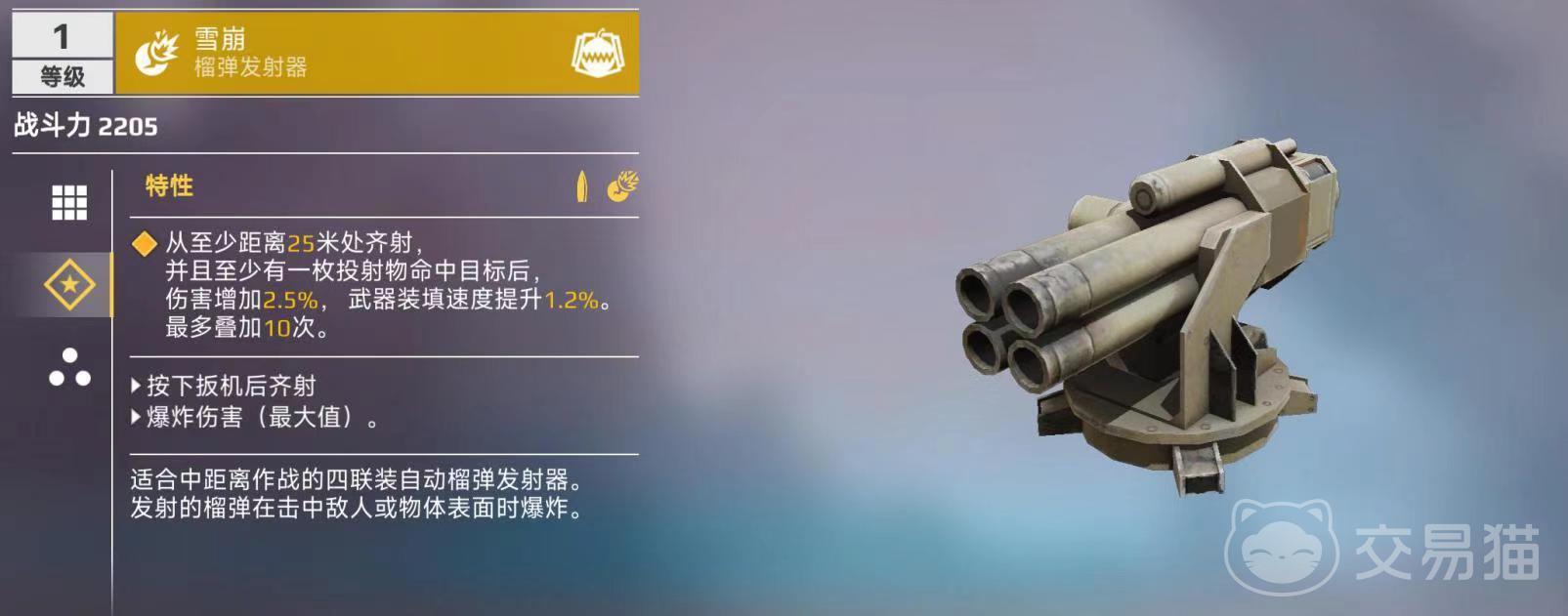 雪崩这款武器是适合中距离作战的四联装自动榴弹发射器,它所发射的榴弹在击中敌人或者是物体表面时就会发生爆炸。该武器在外观方面比较有进攻感,它在口径方面增大了很多,特性为从至少距离25米处齐射,并且至少有一枚投射物命中目标后,伤害能增加2.5%,武器装填速度提升1.2%,最多叠加10次。这样的属性加成在一层的时候或许并不明显,但是当战斗进行一段时间叠加到10层的时候,伤害和装填速度都会得到明显提升。