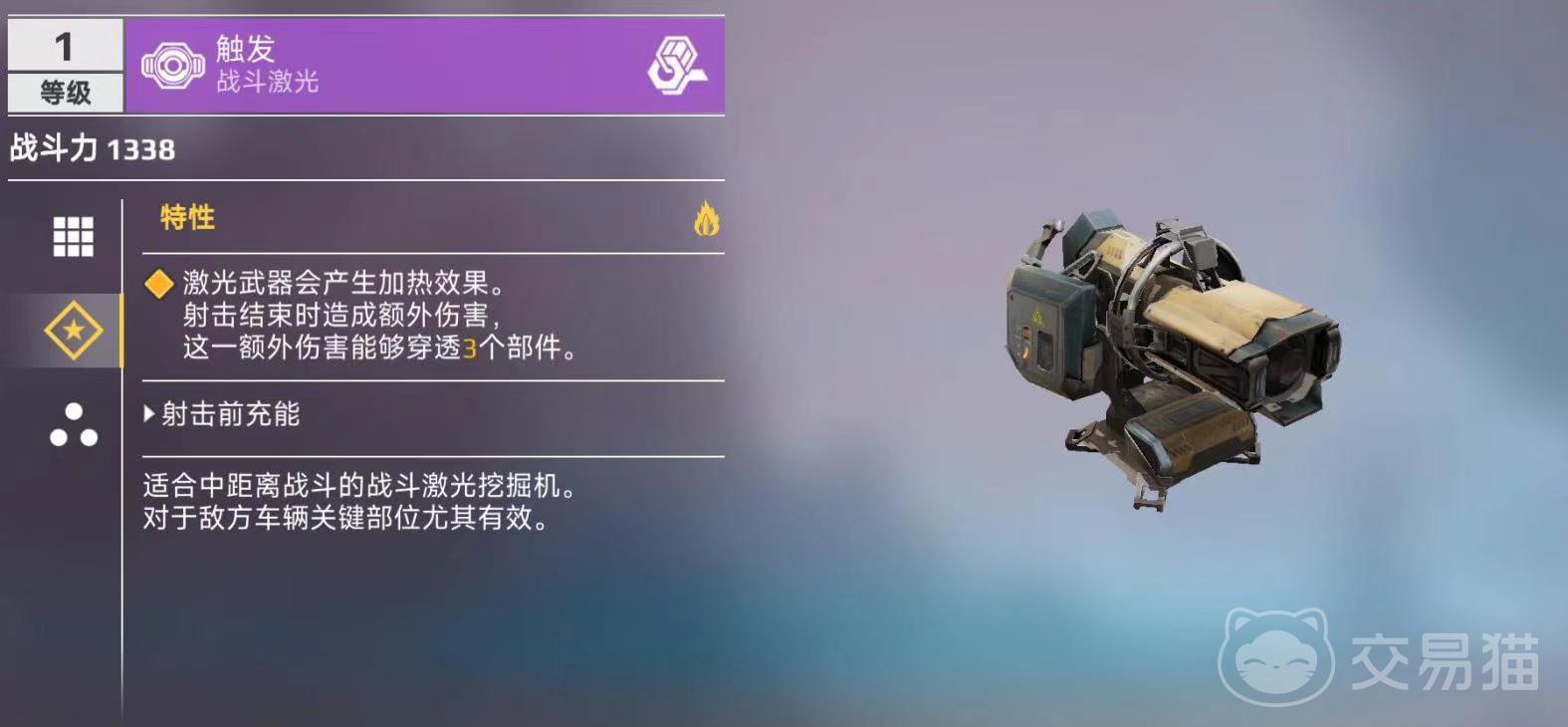 第二个特性,结构部件受到更大的伤害,命中后会对该部件进行加热,且无须装填就能够开火。从这些特性中可以看出,解构光束是另外一项激光武器触发的升级版本,两者在特点上非常相似,所以大家在使用解构光束之前,可以先安装上触发,这样可以做到快速替换。都是通过激光来造成伤害,伤害都比较微弱。不同之处在于,触发需要在一轮射击结束后,才能触发高额伤害。而解构光束不同,可以在摧毁部件时获得充能,在完全充能时才能发射出一道强化后的光束,造成额外伤害、加热效果和冲击力。