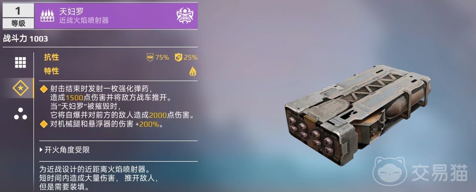 天妇罗是属于喷火器系列,它的攻击方式和常用打火机非常相似。和大多数近战武器相比,天妇罗特点在于能够造成火焰伤害,自身也具有一定的火焰伤害抗性。看一下天妇罗的主要战斗属性,在安装上之后可以大幅度提高对火焰的抗性,射击结束后发生一枚强化弹药,造成伤害并将敌方战车推开。当天妇罗被敌方摧毁时,将进行一次自爆,对前方敌人再造成一次伤害。射击过程中对于机械腿和悬浮器的伤害还有200%加成,缺点在于开火角度受限,毕竟近战武器都有这样的劣势。