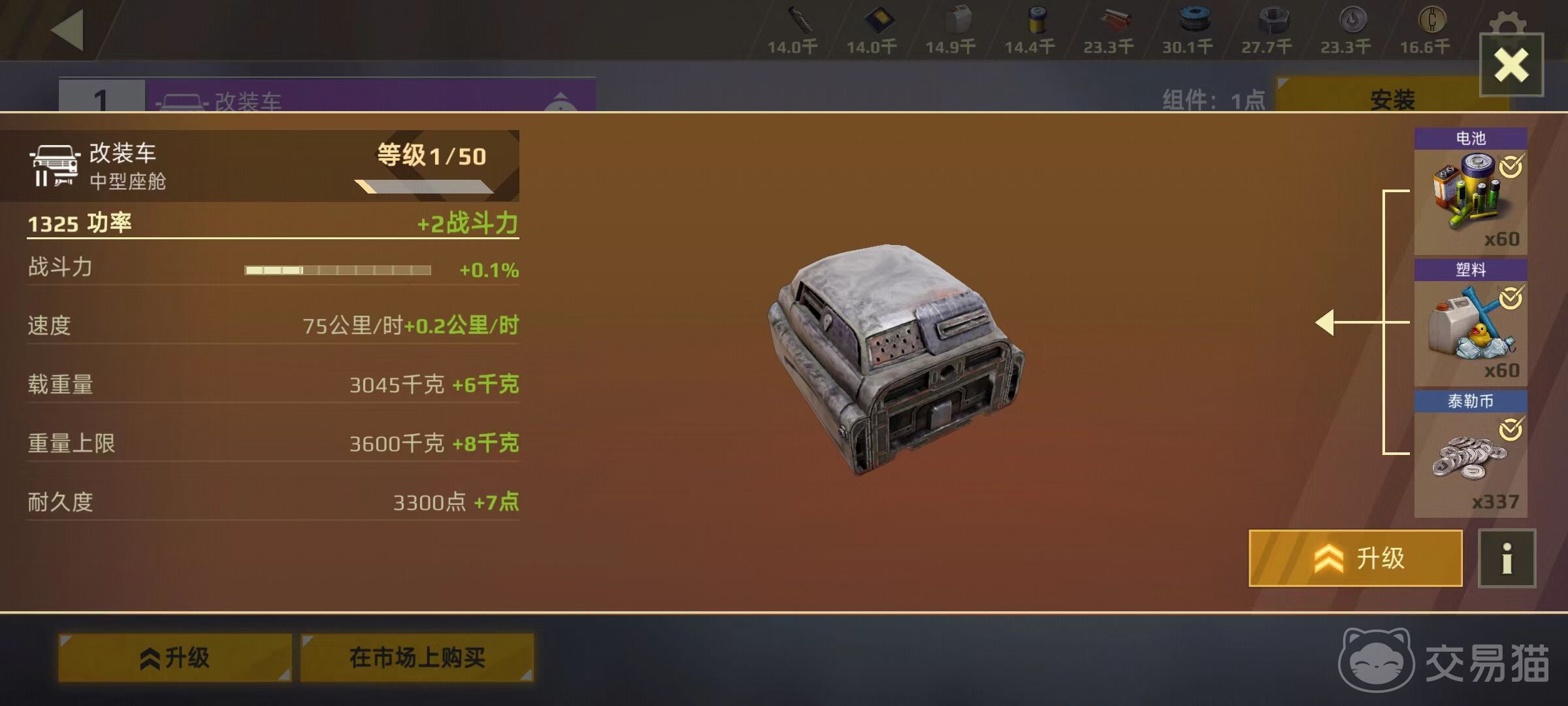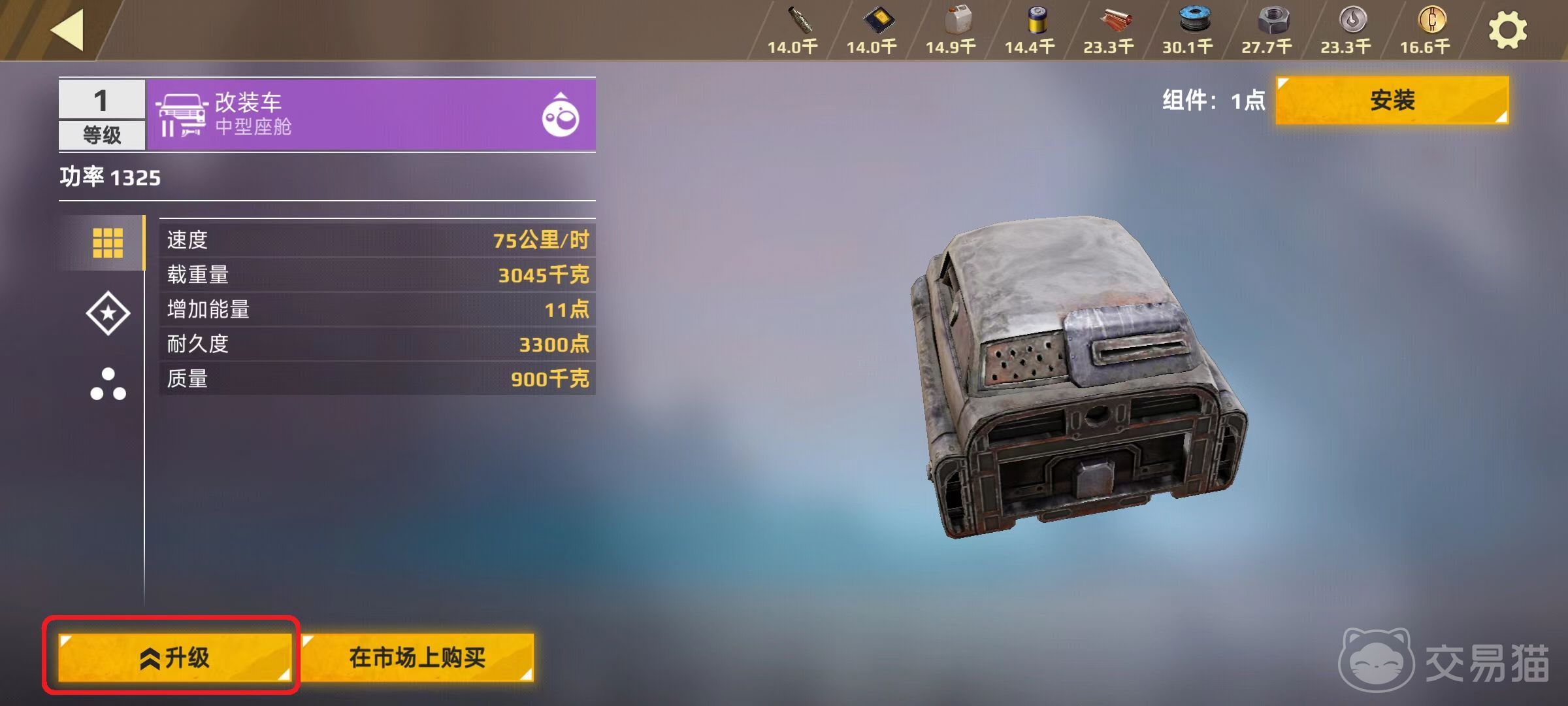 首先大家进入到车库界面,在车库主界面中点击两个齿轮为标志的组件按钮,然后点击上方的存储页面进入到仓库中,这时可以看到史诗级或者是史诗级的部件都有一个黄色的箭头按键,这就意味着这样的部件可以被升级,如果没有则不能被升级。例如现在小编选取了座舱改装车,进入其属性展示页面后,就可以看到它具有可升级的按钮,点击升级就可以进入到相应的升级页面。