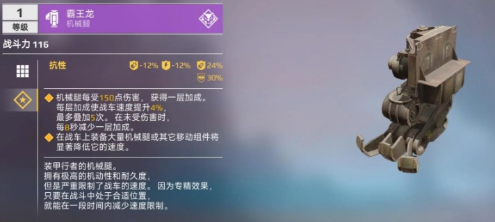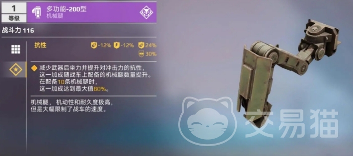 值得一提的是,随着装配数量的增加,它的技能能降低玩家武器后坐力以及自身所受的冲击力,玩家到时候可考虑装配大量“多功能200型”机械腿的,把它作为战车的侧面装甲,如此也能大幅度的提高自身的生存能力。