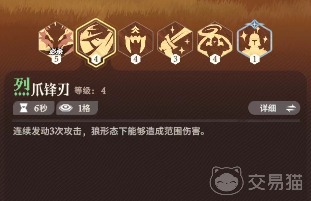 第二个技能是烈爪锋刃,连续向前方攻击三次,前两次造成9%伤害后,第3次攻击造成的伤害最多能达到220%,如果处于狼形态状态,技能攻击范围变为前方一格内的扇形区域。所以该技能要想达到最佳状态,一定要配合一技能狼形态来使用,这样输出才能最大化。
