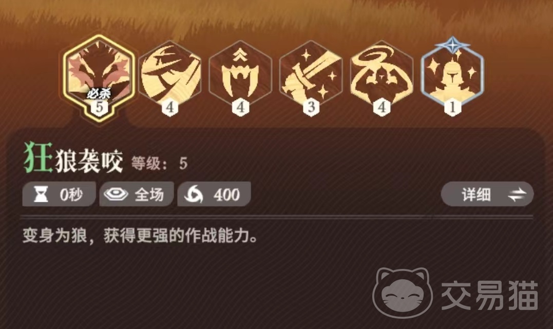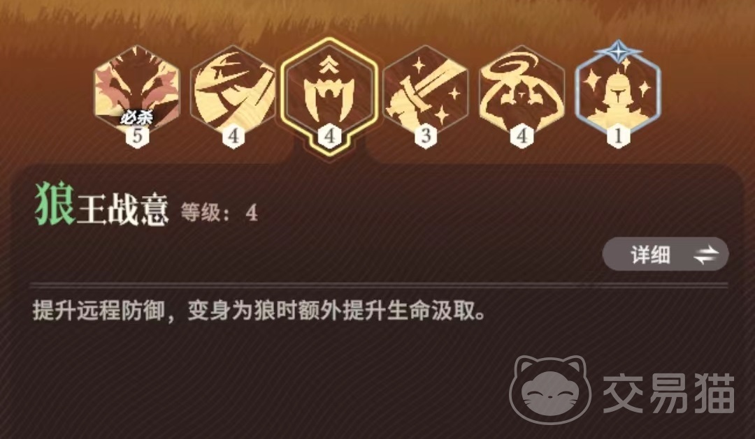 第3个为被动技能狼王战意,沙奎尔被动获得远程防御属性,在狼形态时处于霸体状态获得生命吸取效果,光环内的非召唤友军使自身攻击力获得加成。该技能提升到满级时,生命吸取为40点,远程防御属性提升至30点,光环中的攻击加成为7.5%。该角色战斗中的专精使自身受到的伤害降低,光环范围内的非召唤数量不少于两人时,受到的伤害还有额外降低效果。