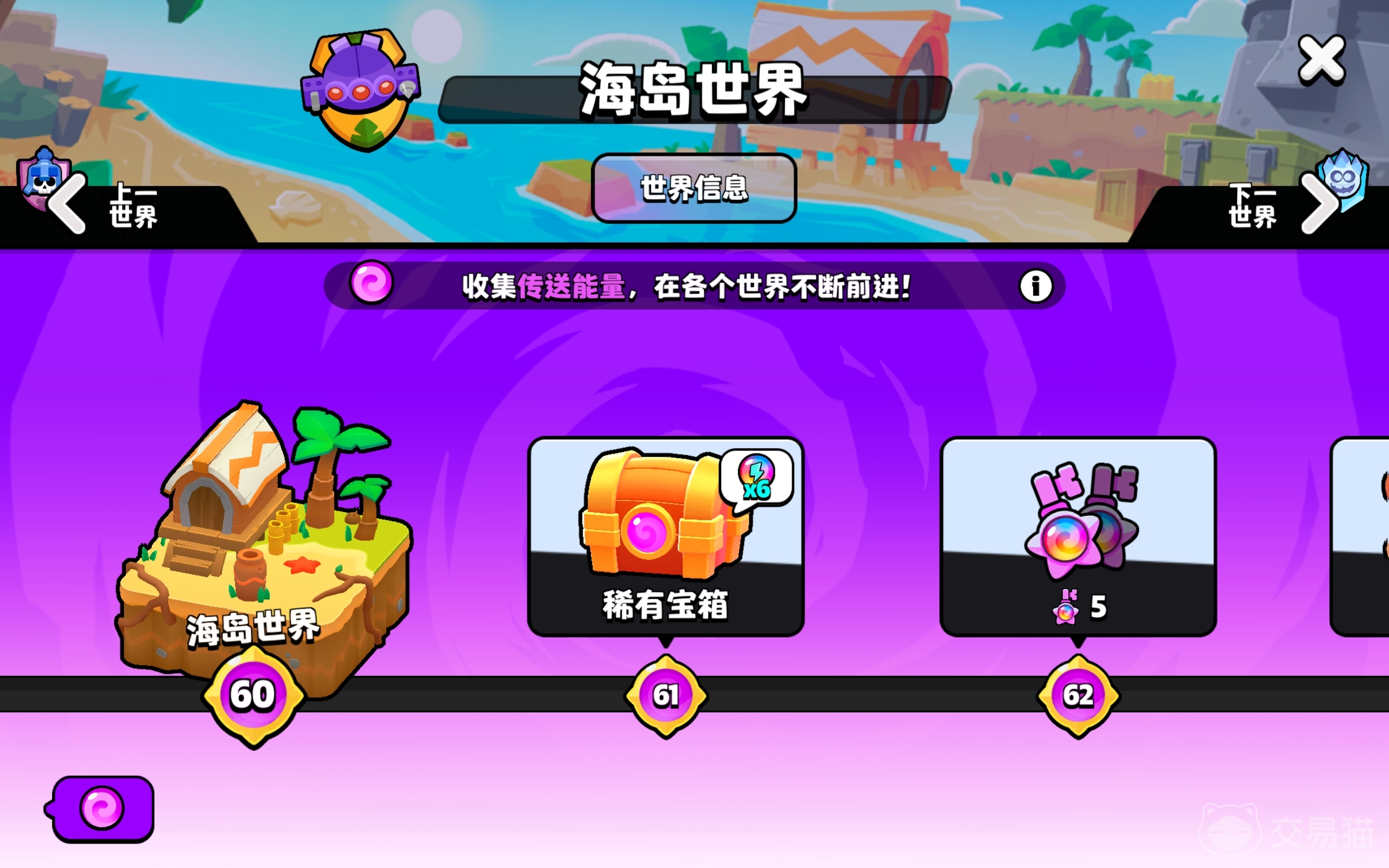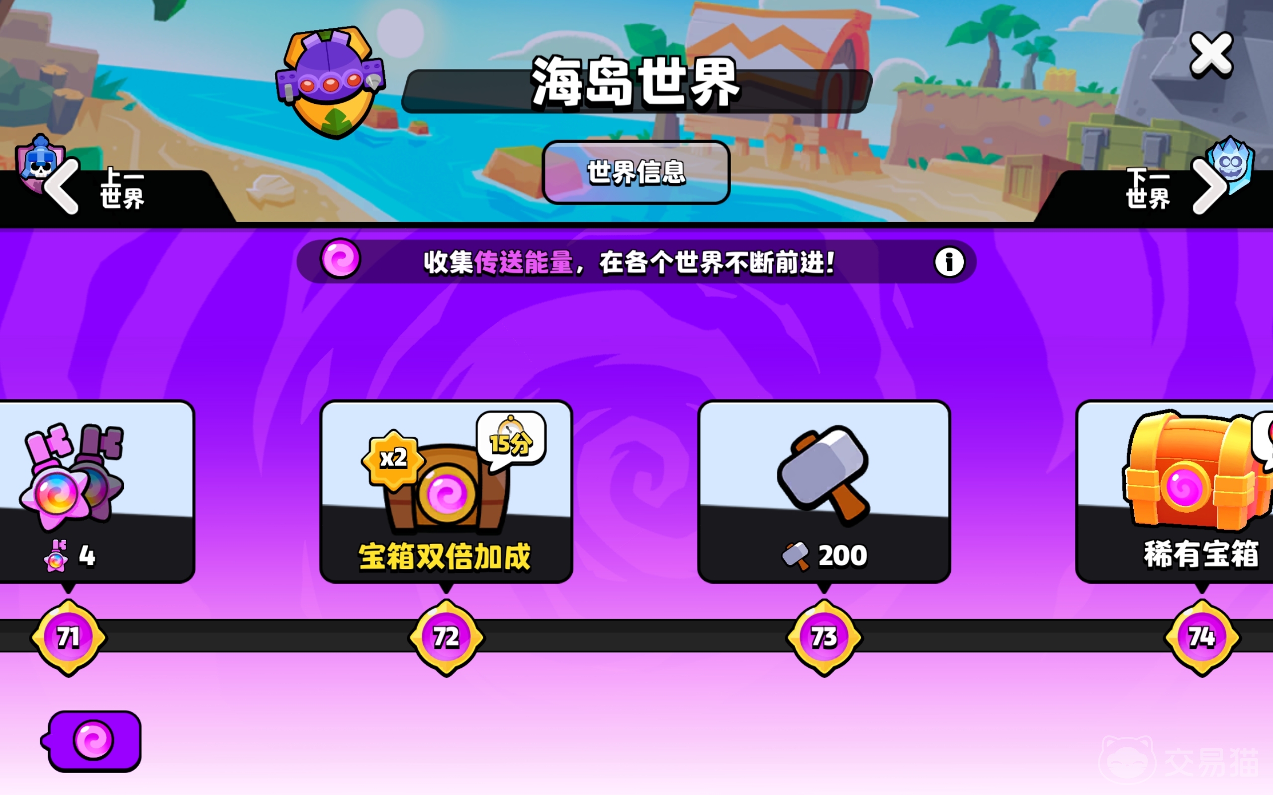 在完成角色觉醒之后,就能得到传送能量,接着就能使用这些物品去升级小队征程,海岛世界就是其中的小队征程的一部分,那么爆裂小队海岛世界奖励有哪些呢?不同类型的世界会触发不一样的随机事件,还会解锁新的角色,升级的过程中,还能兑换到各式各样的豪华奖品,有了这些资源之后,你再参与对战就能拥有更大的优势了。