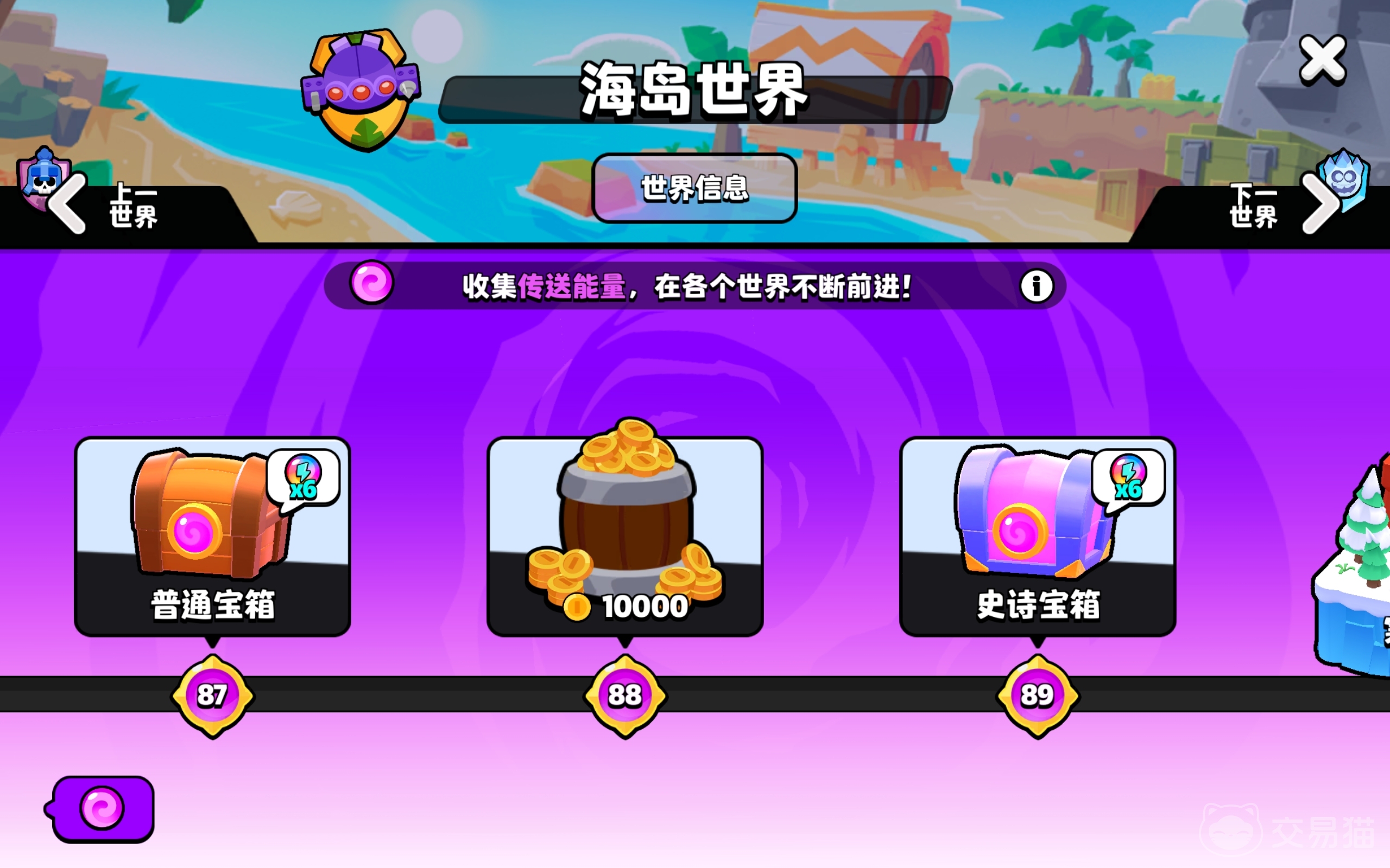 在这个等级区间内,大家能获取到宝箱、金币和宝箱双倍加成的道具,等到了90级你就会进入到寒冰世界。